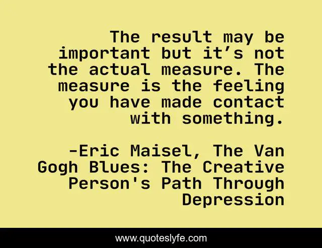 This page presents the quote "The result may be important but it’s not the actual measure. The measure is the feeling you have made contact with something.". Author of this quote is Eric Maisel, The Van Gogh Blues: The Creative Person's Path Through Depression. This quote is about art, creativity, creating, inspiration,.