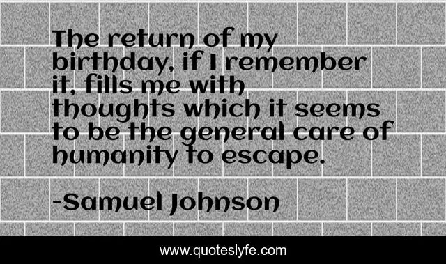 This page presents the quote "The return of my birthday, if I remember it, fills me with thoughts which it seems to be the general care of humanity to escape.". Author of this quote is Samuel Johnson. This quote is about me, humanity, thoughts,.
