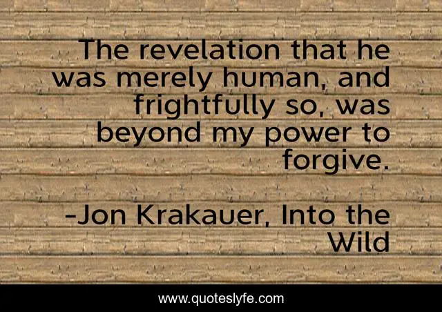 This page presents the quote "The revelation that he was merely human, and frightfully so, was beyond my power to forgive.". Author of this quote is Jon Krakauer, Into the Wild. This quote is about into-the-wild, forgiveness, humanity,.