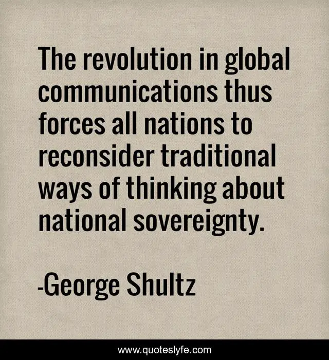 This page presents the quote "The revolution in global communications thus forces all nations to reconsider traditional ways of thinking about national sovereignty.". Author of this quote is George Shultz. This quote is about communication, nationalism, politics,.