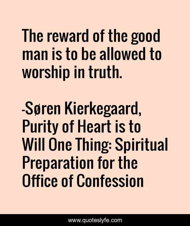 This page presents the quote "The reward of the good man is to be allowed to worship in truth.". Author of this quote is Søren Kierkegaard, Purity of Heart is to Will One Thing: Spiritual Preparation for the Office of Confession. This quote is about the-good, reward, good-man, worship, truth,.