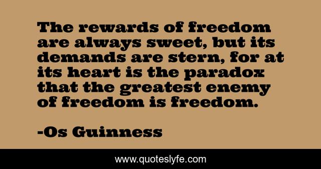 This page presents the quote "The rewards of freedom are always sweet, but its demands are stern, for at its heart is the paradox that the greatest enemy of freedom is freedom.". Author of this quote is Os Guinness. This quote is about heart, greatest, sweet,.