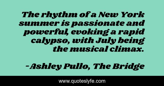 This page presents the quote "The rhythm of a New York summer is passionate and powerful, evoking a rapid calypso, with July being the musical climax.". Author of this quote is Ashley Pullo, The Bridge. This quote is about summer, music, new-york,.