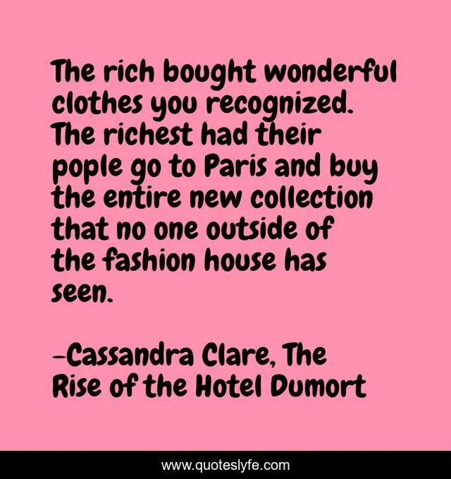 This page presents the quote "The rich bought wonderful clothes you recognized. The richest had their pople go to Paris and buy the entire new collection that no one outside of the fashion house has seen.". Author of this quote is Cassandra Clare, The Rise of the Hotel Dumort. This quote is about magnus-bane, fashion, richest, clothes,.