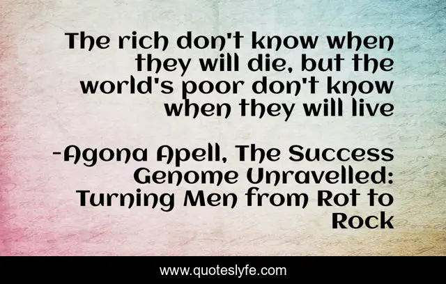 This page presents the quote "The rich don't know when they will die, but the world's poor don't know when they will live". Author of this quote is Agona Apell, The Success Genome Unravelled: Turning Men from Rot to Rock. This quote is about money, life, poverty-alleviation, wealth, success,.