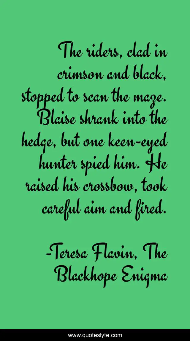 This page presents the quote "The riders, clad in crimson and black, stopped to scan the maze. Blaise shrank into the hedge, but one keen-eyed hunter spied him. He raised his crossbow, took careful aim and fired.". Author of this quote is Teresa Flavin, The Blackhope Enigma. This quote is about mystery, art, young-adult, adventure, history,.