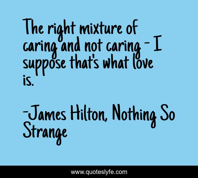 This page presents the quote "The right mixture of caring and not caring - I suppose that's what love is.". Author of this quote is James Hilton, Nothing So Strange. This quote is about caring, love, affection,.