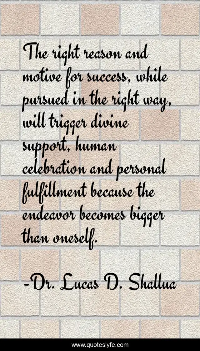 This page presents the quote "The right reason and motive for success, while pursued in the right way, will trigger divine support, human celebration and personal fulfillment because the endeavor becomes bigger than oneself.". Author of this quote is Dr. Lucas D. Shallua. This quote is about motivation, shallua, success, wisdom,.