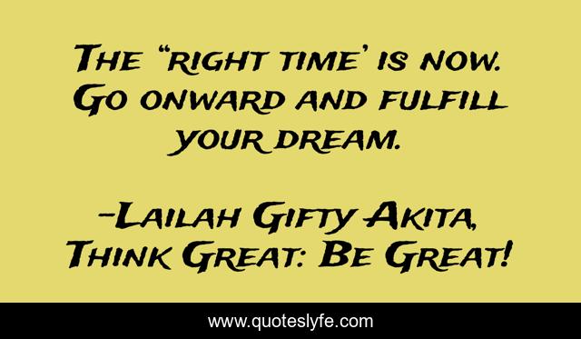 "Lailah Gifty Akita, Think Great: Be Great! Quotes." Quoteslyfe.com, 2025. Fri. 05 Dec. 2025. <https://www.quoteslyfe.com/quote/The-right-time-is-now-Go-onward-34531>.