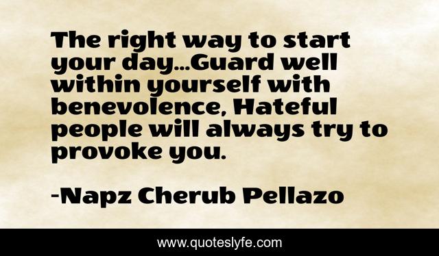 This page presents the quote "The right way to start your day...Guard well within yourself with benevolence, Hateful people will always try to provoke you.". Author of this quote is Napz Cherub Pellazo. This quote is about right-path, benevolence, inspirational, enthusiasm, guard-well, kindness, start-day,.