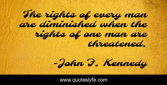 This page presents the quote "The rights of every man are diminished when the rights of one man are threatened.". Author of this quote is John F. Kennedy. This quote is about politics, human-rights, inspirational, enthusiasm,.