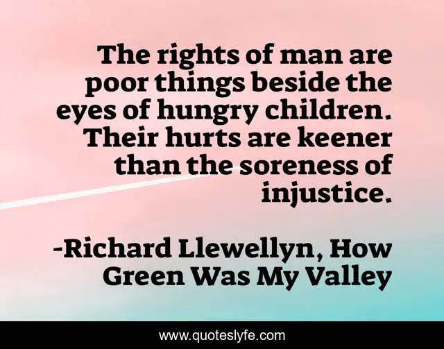 This page presents the quote "The rights of man are poor things beside the eyes of hungry children. Their hurts are keener than the soreness of injustice.". Author of this quote is Richard Llewellyn, How Green Was My Valley. This quote is about injustice, rights-of-man,.