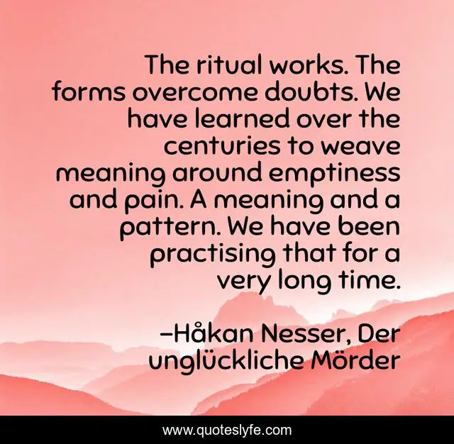 This page presents the quote "The ritual works. The forms overcome doubts. We have learned over the centuries to weave meaning around emptiness and pain. A meaning and a pattern. We have been practising that for a very long time.". Author of this quote is Håkan Nesser, Der unglückliche Mörder. .