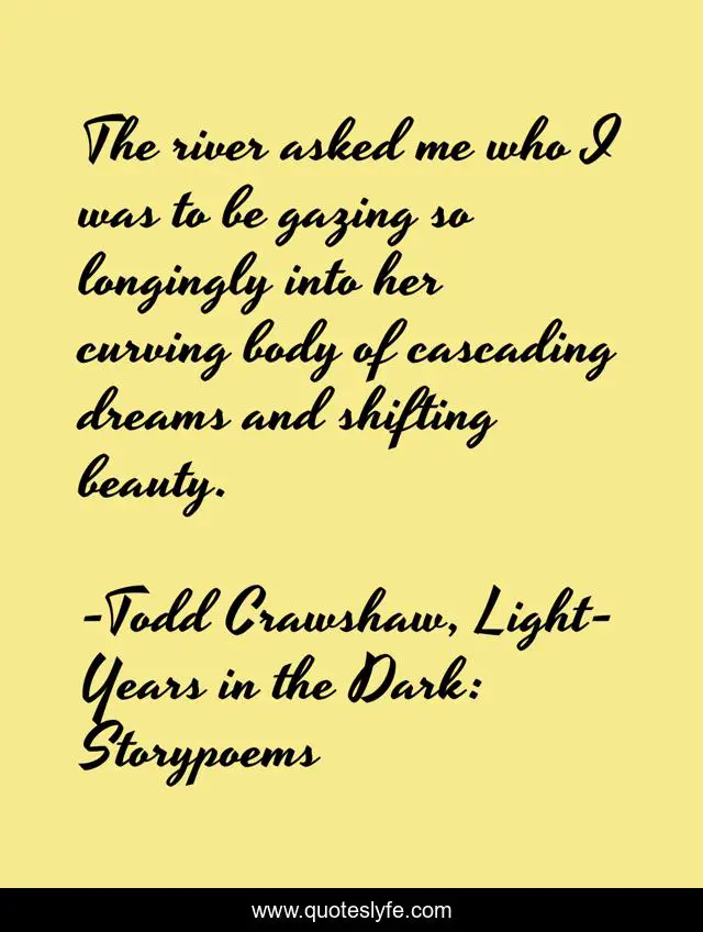 This page presents the quote "The river asked me who I was to be gazing so longingly into her curving body of cascading dreams and shifting beauty.". Author of this quote is Todd Crawshaw, Light-Years in the Dark: Storypoems. This quote is about river, beauty, life-lessons,.