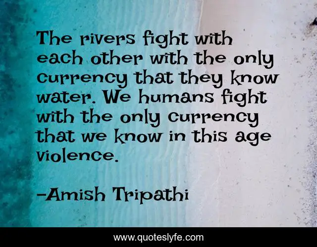 This page presents the quote "The rivers fight with each other with the only currency that they know water. We humans fight with the only currency that we know in this age violence.". Author of this quote is Amish Tripathi. This quote is about water, currency, river, fight, violence,.