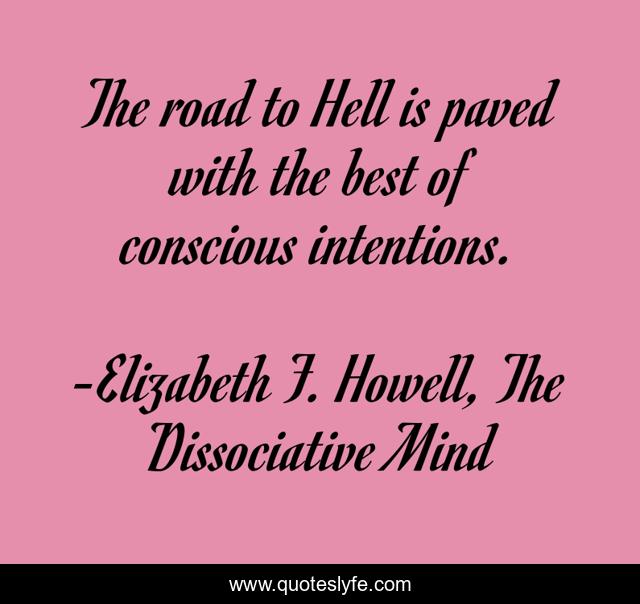 This page presents the quote "The road to Hell is paved with the best of conscious intentions.". Author of this quote is Elizabeth F. Howell, The Dissociative Mind. This quote is about hell, intention,.