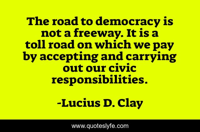 This page presents the quote "The road to democracy is not a freeway. It is a toll road on which we pay by accepting and carrying out our civic responsibilities.". Author of this quote is Lucius D. Clay. This quote is about rule, government,.