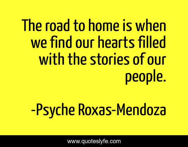 This page presents the quote "The road to home is when we find our hearts filled with the stories of our people.". Author of this quote is Psyche Roxas-Mendoza. This quote is about hearts, people, stories, filled, home, our, find, road,.