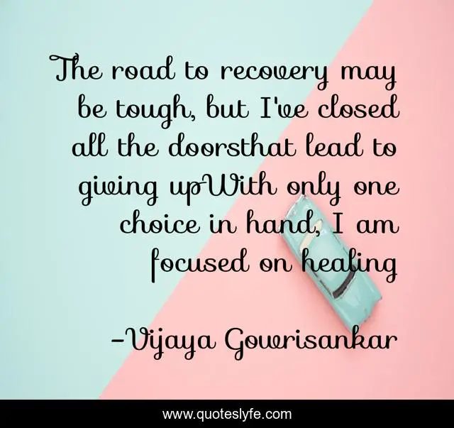 This page presents the quote "The road to recovery may be tough, but I've closed all the doorsthat lead to giving upWith only one choice in hand, I am focused on healing". Author of this quote is Vijaya Gowrisankar. This quote is about tough, closed, choice, focused, healing, doors, give-up, road, recovery,.