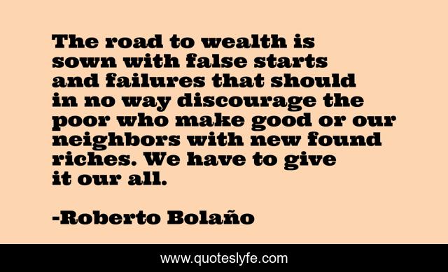 This page presents the quote "The road to wealth is sown with false starts and failures that should in no way discourage the poor who make good or our neighbors with new found riches. We have to give it our all.". Author of this quote is Roberto Bolaño. This quote is about wealth, inspiration,.