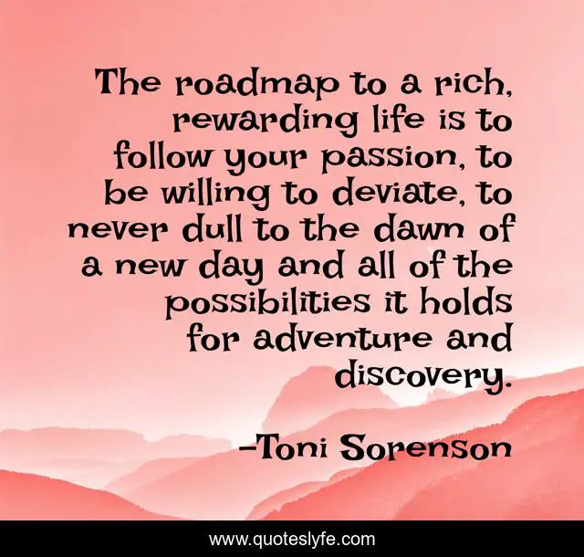 This page presents the quote "The roadmap to a rich, rewarding life is to follow your passion, to be willing to deviate, to never dull to the dawn of a new day and all of the possibilities it holds for adventure and discovery.". Author of this quote is Toni Sorenson. This quote is about life, courage, adventure, daring,.