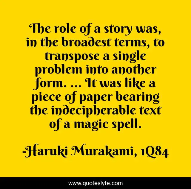 This page presents the quote "The role of a story was, in the broadest terms, to transpose a single problem into another form. ... It was like a piece of paper bearing the indecipherable text of a magic spell.". Author of this quote is Haruki Murakami, 1Q84. This quote is about magic, stories, storytelling,.