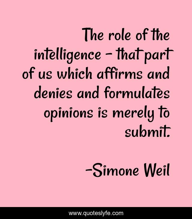 This page presents the quote "The role of the intelligence - that part of us which affirms and denies and formulates opinions is merely to submit.". Author of this quote is Simone Weil. This quote is about opinions, role, submit,.