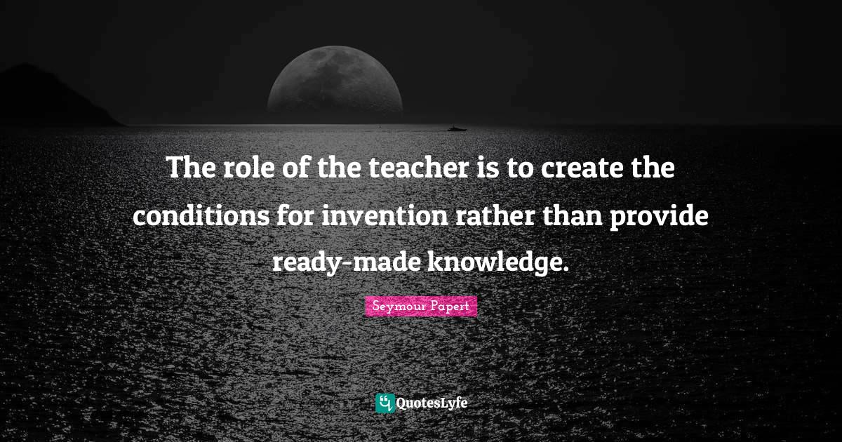 This page presents the quote "The role of the teacher is to create the conditions for invention rather than provide ready-made knowledge.". Author of this quote is Seymour Papert. This quote is about knowledge, teacher, conditions, school, education, ready, made, invention,.