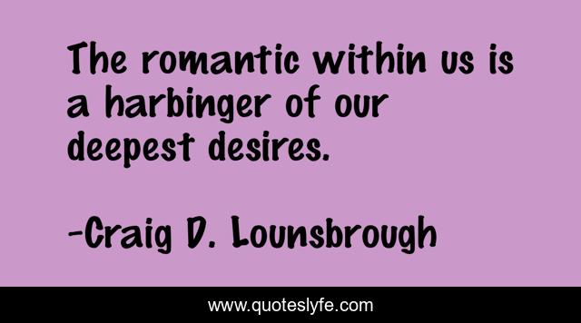 This page presents the quote "The romantic within us is a harbinger of our deepest desires.". Author of this quote is Craig D. Lounsbrough. This quote is about desire, core, harbinger, love, romantic, desires, heart, soul, romance,.