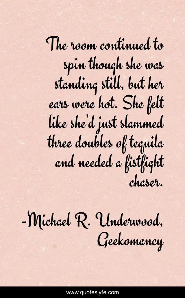This page presents the quote "The room continued to spin though she was standing still, but her ears were hot. She felt like she'd just slammed three doubles of tequila and needed a fistfight chaser.". Author of this quote is Michael R. Underwood, Geekomancy. This quote is about geek, humor, urban-fantasy, gamer,.