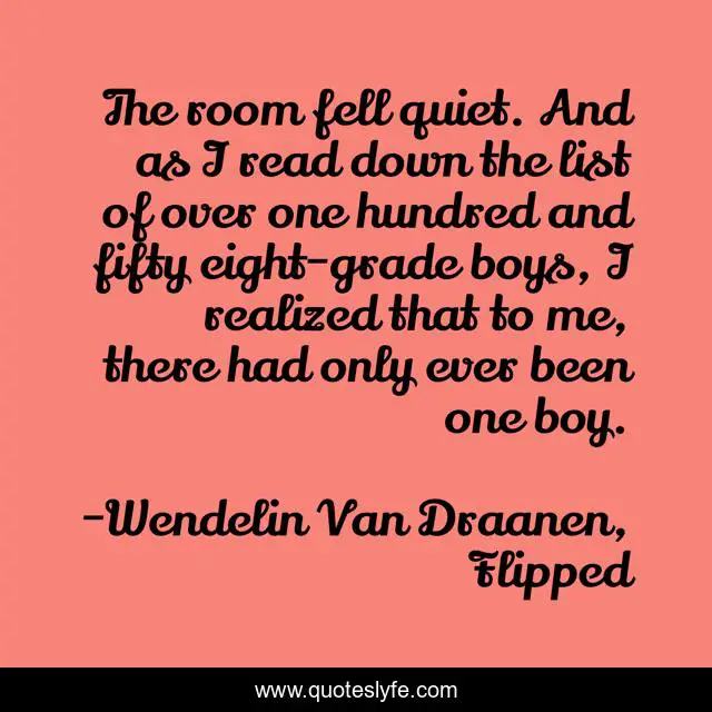 This page presents the quote "The room fell quiet. And as I read down the list of over one hundred and fifty eight-grade boys, I realized that to me, there had only ever been one boy.". Author of this quote is Wendelin Van Draanen, Flipped. This quote is about there-had-only-been-you, julie-baker, bhie, flipped, crush, bryce-loski, love, affection,.