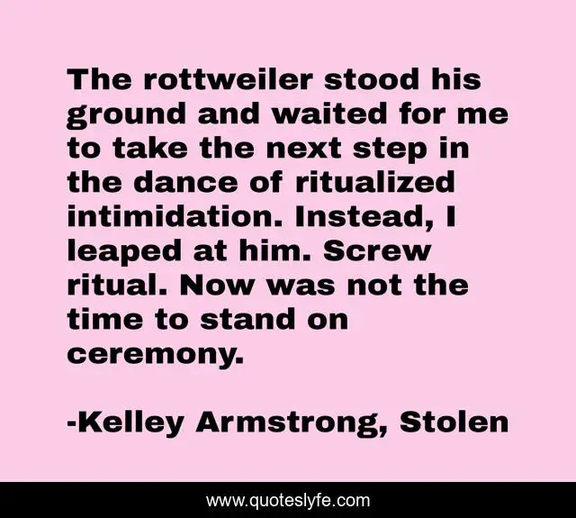 This page presents the quote "The rottweiler stood his ground and waited for me to take the next step in the dance of ritualized intimidation. Instead, I leaped at him. Screw ritual. Now was not the time to stand on ceremony.". Author of this quote is Kelley Armstrong, Stolen. This quote is about elena-michaels, humour,.