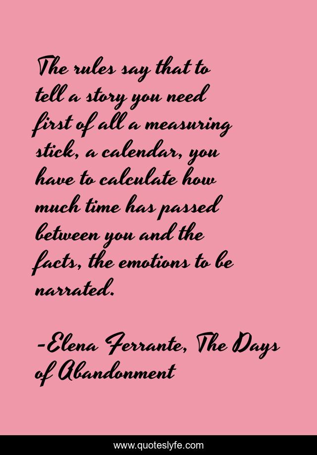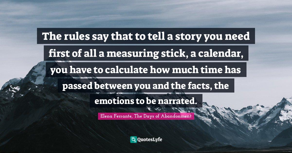This page presents the quote "The rules say that to tell a story you need first of all a measuring stick, a calendar, you have to calculate how much time has passed between you and the facts, the emotions to be narrated.". Author of this quote is Elena Ferrante, The Days of Abandonment. This quote is about distance, story, narration,.