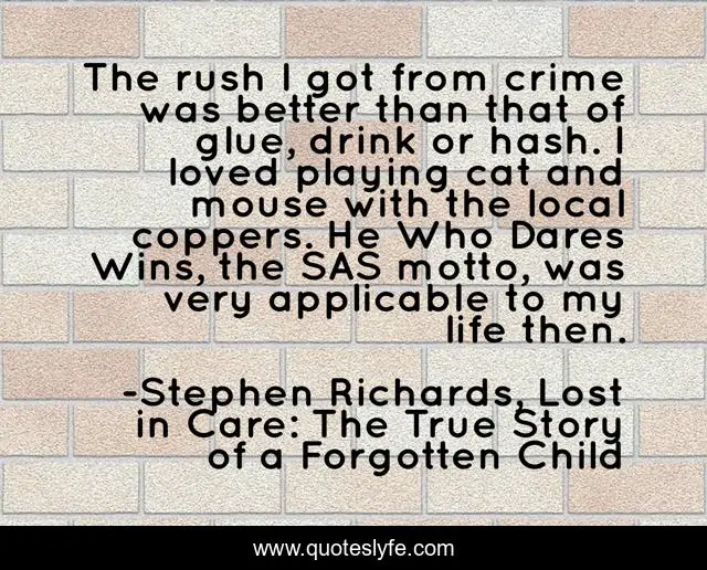 This page presents the quote "The rush I got from crime was better than that of glue, drink or hash. I loved playing cat and mouse with the local coppers. He Who Dares Wins, the SAS motto, was very applicable to my life then.". Author of this quote is Stephen Richards, Lost in Care: The True Story of a Forgotten Child. This quote is about child-abuse, children-s-care-home-abuse, scottish-child-care, overcoming-child-abuse, scottish-prison-system, childhood-traumas, stephen-richards-author, childhood-abuse, jimmy-holland,.