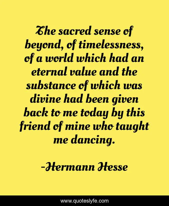 This page presents the quote "The sacred sense of beyond, of timelessness, of a world which had an eternal value and the substance of which was divine had been given back to me today by this friend of mine who taught me dancing.". Author of this quote is Hermann Hesse. This quote is about friends, dancing,.