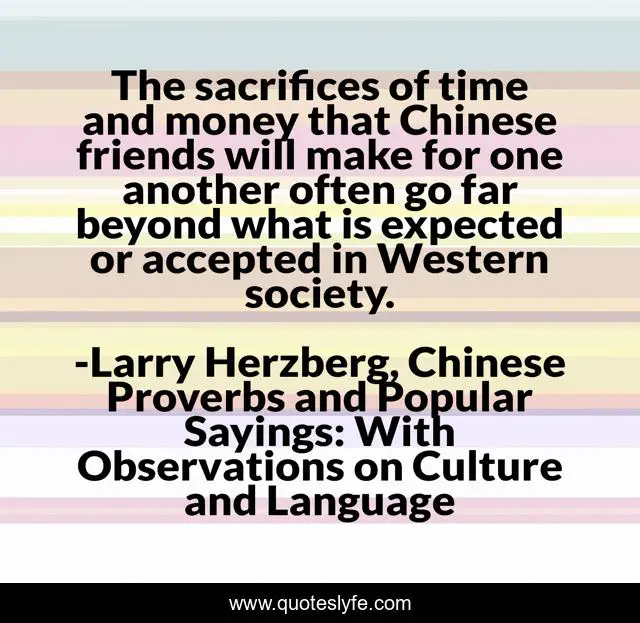 This page presents the quote "The sacrifices of time and money that Chinese friends will make for one another often go far beyond what is expected or accepted in Western society.". Author of this quote is Larry Herzberg, Chinese Proverbs and Popular Sayings: With Observations on Culture and Language. This quote is about sayings, chinese, language, proverbs, travel, culture, china,.
