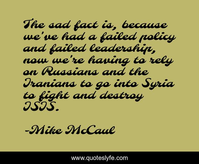 This page presents the quote "The sad fact is, because we've had a failed policy and failed leadership, now we're having to rely on Russians and the Iranians to go into Syria to fight and destroy ISIS.". Author of this quote is Mike McCaul. This quote is about now, sad, fight,.