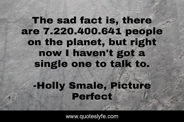 This page presents the quote "The sad fact is, there are 7.220.400.641 people on the planet, but right now I haven't got a single one to talk to.". Author of this quote is Holly Smale, Picture Perfect. This quote is about life, love, family, new-york, geek, london, girl, friendship, model,.