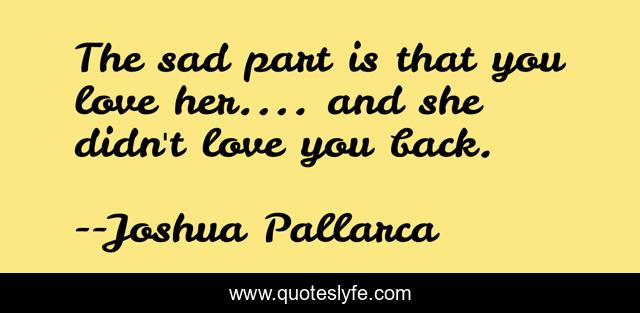 This page presents the quote "The sad part is that you love her.... and she didn't love you back.". Author of this quote is -Joshua Pallarca. This quote is about relationships, sad-but-true, love, hurt, lies, truth-lies-hurt, sad, sadness-of-love, affection,.