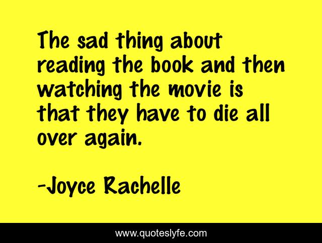 This page presents the quote "The sad thing about reading the book and then watching the movie is that they have to die all over again.". Author of this quote is Joyce Rachelle. This quote is about reading-blues, book-to-film, favorite-characters, book-adaptations, character-deaths, book-to-movie, bookworm, reading, book-to-movie-adaptations,.