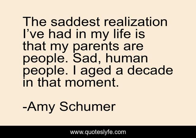 This page presents the quote "The saddest realization I’ve had in my life is that my parents are people. Sad, human people. I aged a decade in that moment.". Author of this quote is Amy Schumer. This quote is about humor, parents,.