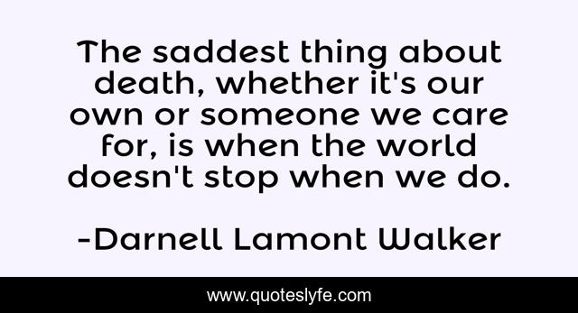 This page presents the quote "The saddest thing about death, whether it's our own or someone we care for, is when the world doesn't stop when we do.". Author of this quote is Darnell Lamont Walker. This quote is about sorrow, death, life, moving-on,.