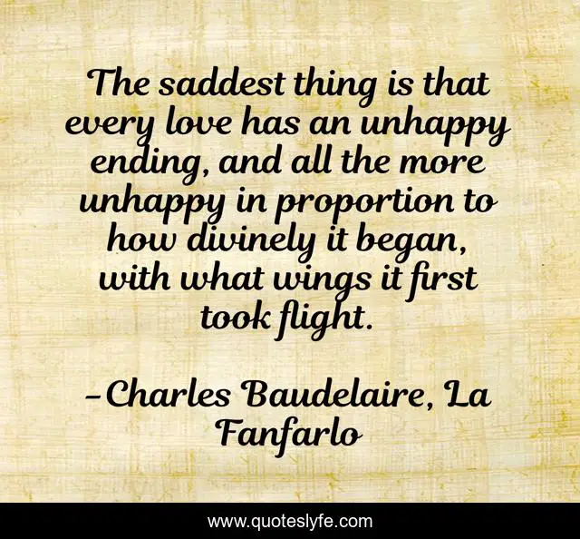 This page presents the quote "The saddest thing is that every love has an unhappy ending, and all the more unhappy in proportion to how divinely it began, with what wings it first took flight.". Author of this quote is Charles Baudelaire, La Fanfarlo. This quote is about love, affection, sad,.