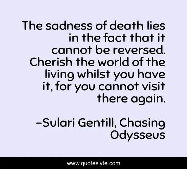 This page presents the quote "The sadness of death lies in the fact that it cannot be reversed. Cherish the world of the living whilst you have it, for you cannot visit there again.". Author of this quote is Sulari Gentill, Chasing Odysseus. .
