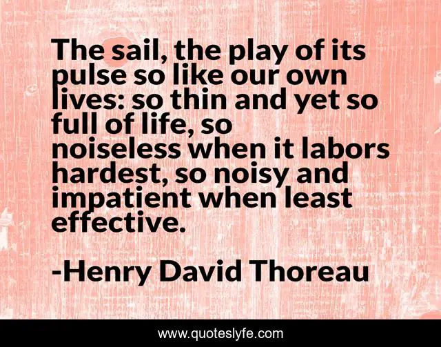 This page presents the quote "The sail, the play of its pulse so like our own lives: so thin and yet so full of life, so noiseless when it labors hardest, so noisy and impatient when least effective.". Author of this quote is Henry David Thoreau. .