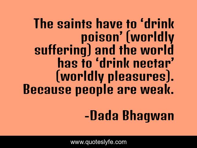 This page presents the quote "The saints have to ‘drink poison’ (worldly suffering) and the world has to ‘drink nectar’ (worldly pleasures). Because people are weak.". Author of this quote is Dada Bhagwan. This quote is about spiritual, suffering, worldly, poison,.