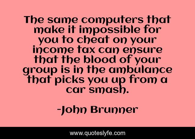 This page presents the quote "The same computers that make it impossible for you to cheat on your income tax can ensure that the blood of your group is in the ambulance that picks you up from a car smash.". Author of this quote is John Brunner. This quote is about car, blood, impossible,.