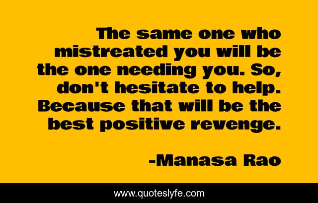 This page presents the quote "The same one who mistreated you will be the one needing you. So, don't hesitate to help. Because that will be the best positive revenge.". Author of this quote is Manasa Rao. This quote is about life-lessons, revenge, relationship, hurt,.