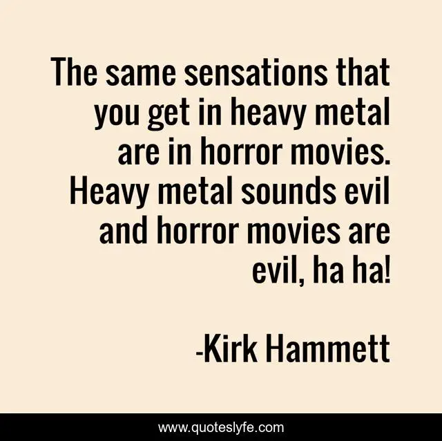 This page presents the quote "The same sensations that you get in heavy metal are in horror movies. Heavy metal sounds evil and horror movies are evil, ha ha!". Author of this quote is Kirk Hammett. This quote is about horror, evil,.