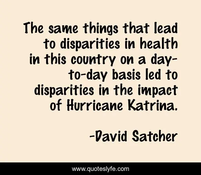 This page presents the quote "The same things that lead to disparities in health in this country on a day-to-day basis led to disparities in the impact of Hurricane Katrina.". Author of this quote is David Satcher. This quote is about impact, country, lead,.